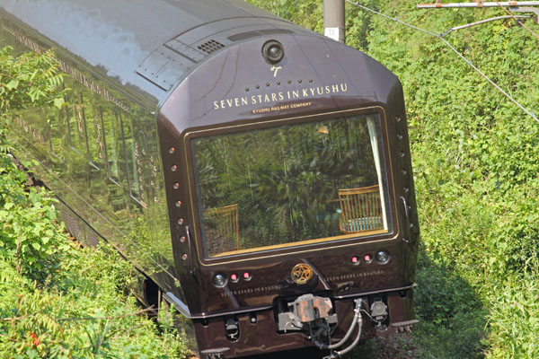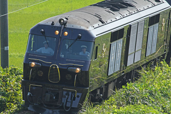 しばらくぶりのななつ星 運転室になぜか乗務員二人 フェイスと側面はいつ見てもつるりんに輝いている。