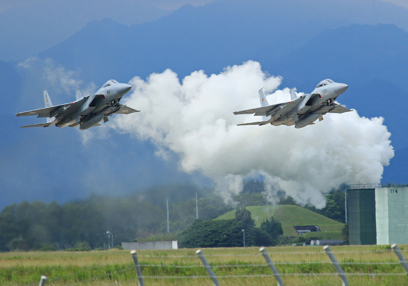 2機そろって離陸するf15の写真