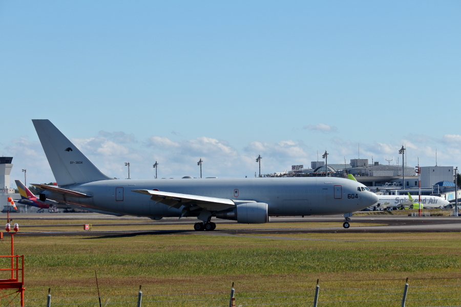 空気が澄んでいて遠くまで見渡せ気持ちよかった。それに見たことのない空中給油輸送機まで宮崎空港に着陸して、ワクワク楽しめた。どうしてこの空港にやってきたかはわからない。想像するにどこの空港にでも緊急着陸できるよう訓練しているのだろう。気づきましたか、ボディー側面に窓がないんです。ほかに垂直尾翼に馬みたいなマークが小さく描いてあります。機体ベースはB767でした。