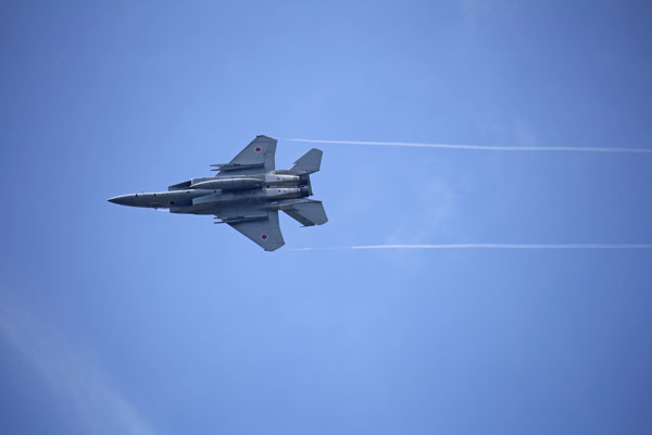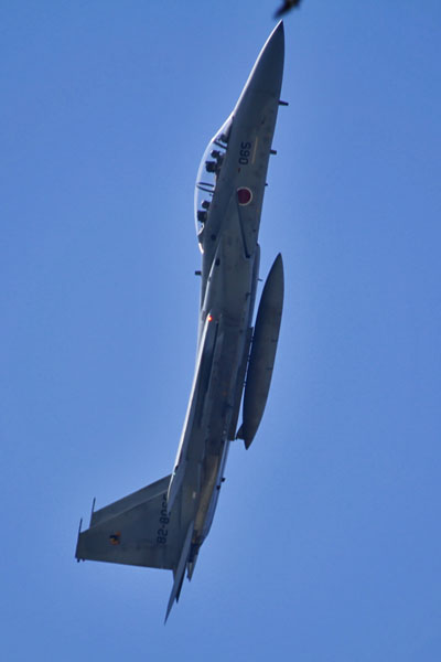 青空を疾走するF-15 新田原基地 更新ネタがないので5月の新田を掲載。 後日の見直しで発見。おっーいいじゃん。 あぁ鳥ちゃんが串刺しに・・・ 右に旋回するF15を見上げて撮影したものです。もちろん偶然です。トリミング