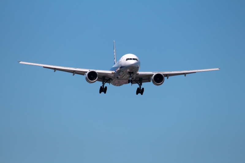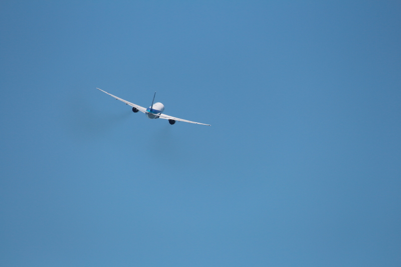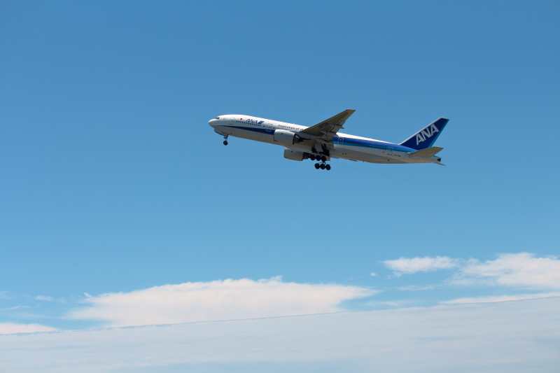海に向かって離陸したトリプルセブン。左右にそれぞれ6個のタイヤがついているのが特徴。写真下に見える直線的な雲の淵はどんな条件で作られたのか不思議に思える。気持ちいい青空で撮影できてよかった。